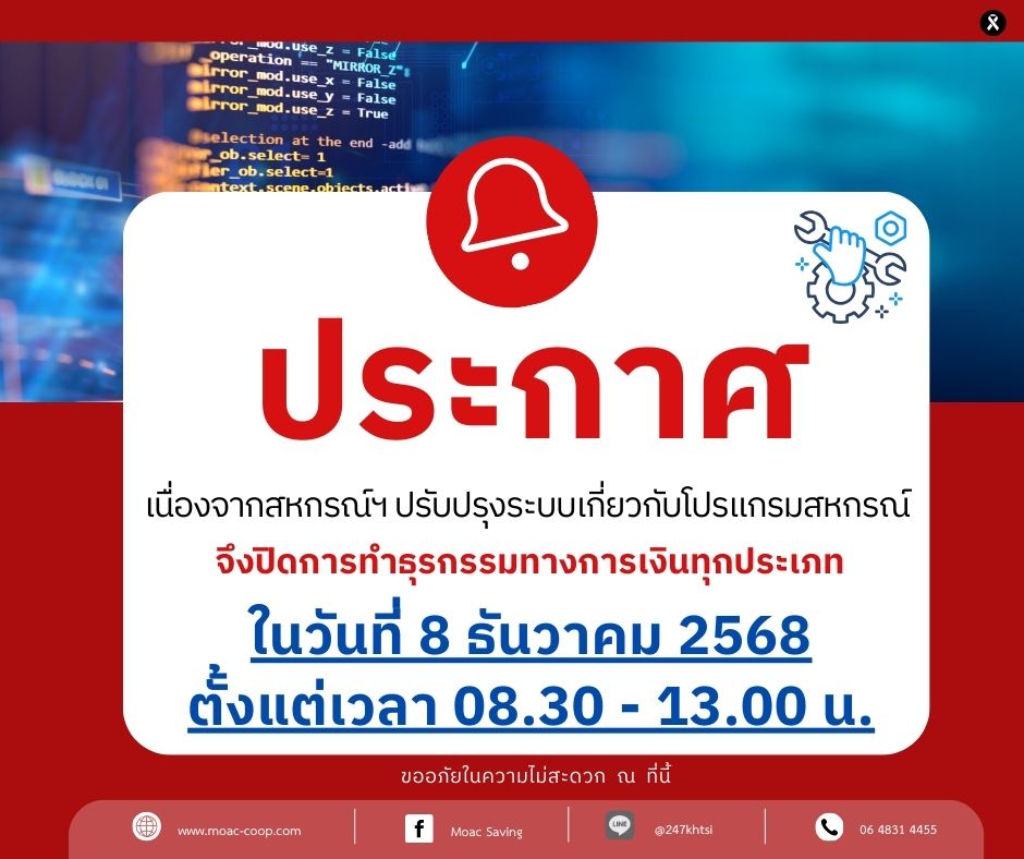 ประกาศ สอ.กษ ปิดการทำธุรกรรมทางการเงิน ในวันที่ 1 ธันวาคม 2568 ตั้งแต่เวลา 08.30 - 12.00 น.