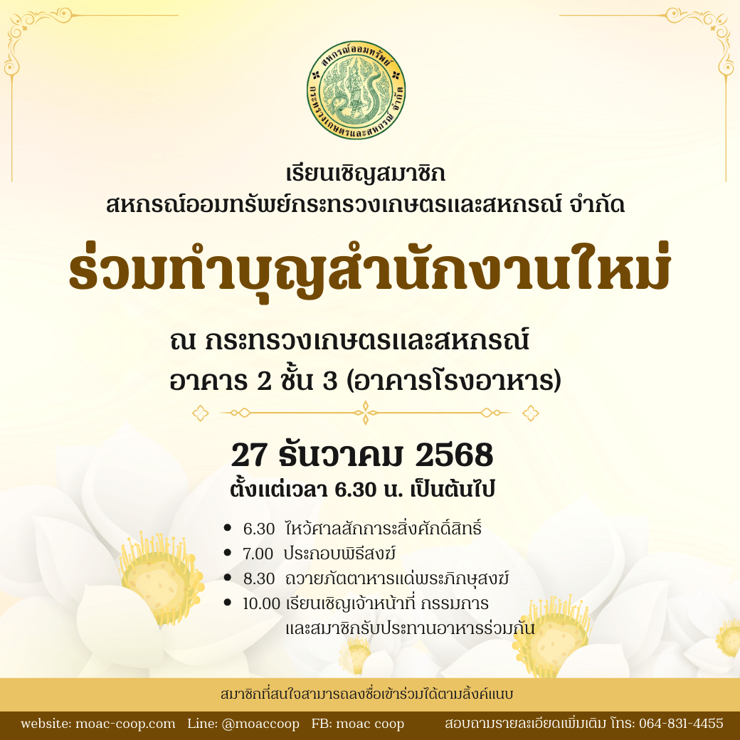 เรียนเชิญสมาชิกสหกรณ์ฯ ร่วมทำบุญสำนักงาน วันเสาร์ที่ 27 ธันวาคม 2568 ตั้งแต่เวลา 7.00 น. เป็นต้นไป