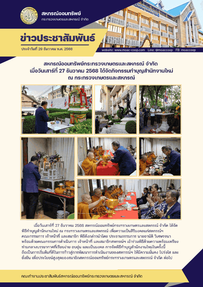 เมื่อวันที่ 27 ธันวาคม 2568 สหกรณ์ฯ ได้จัดกิจกรรมทำบุญสำนักงานใหม่ ณ กระทรวงเกษตรและสหกรณ์