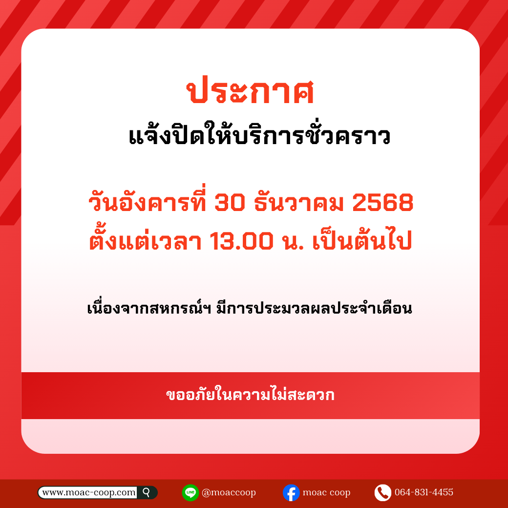 ประกาศ แจ้งปิดให้บริการ วันที่ 30 ธันวาคม 2568 ตั้งแต่เวลา 13.00 น. เป็นต้นไป