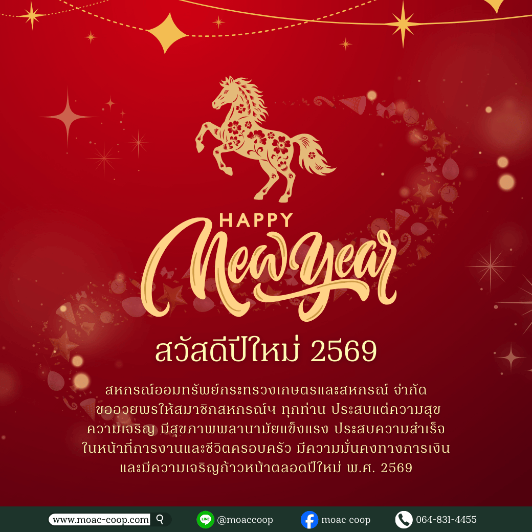 สวัสดีปีใหม่ 2569 สหกรณ์ออมทรัพย์กระทรวงเกษตรและสหกรณ์ จำกัด ขออวยพรให้สมาชิกทุกท่าน มีความสุข ความเจริญ มั่นคงทั้งชีวิตและการเงิน