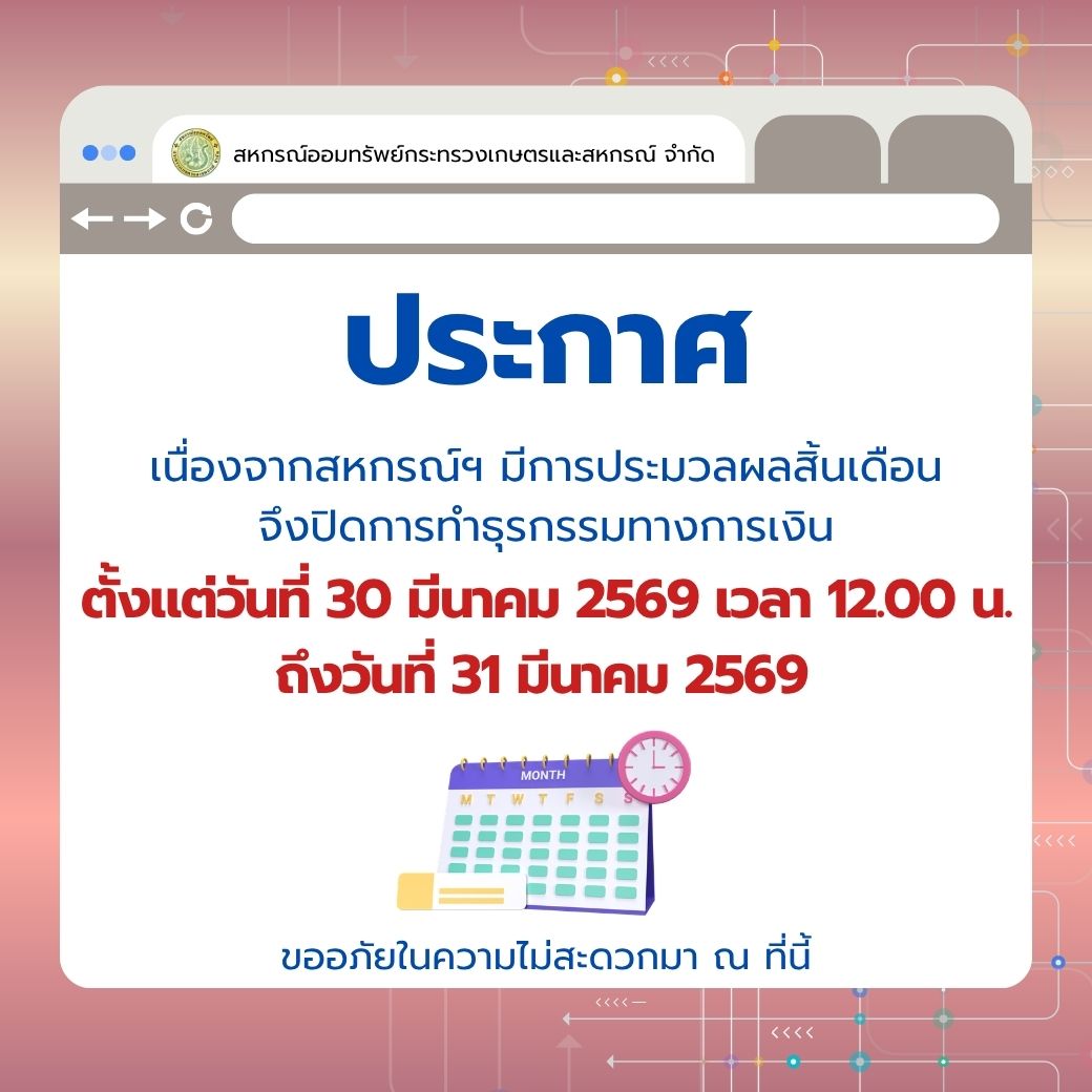 ประกาศ เนื่องจากสหกรณ์ฯ มีการประมวลผลสิ้นเดือน จึงปิดการทำธุรกรรมทางการเงิน ตั้งแต่วันที่ 30 มีนาคม 2569 เวลา 12.00 น. ถึงวันที่ 31 มีนาคม 2569