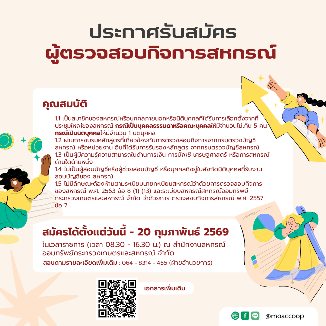 ประกาศ สอ.กษ. เรื่อง การรับสมัครผู้ตรวจสอบกิจการสหกรณ์ ประจำปี 2569