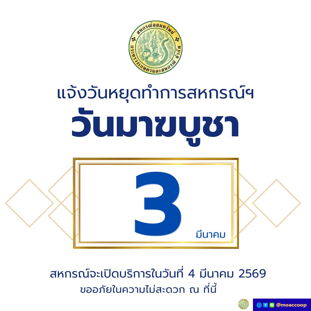 ขอปิดทำการ วันที่ 5 - 6 เมษายน 2565 ตามคำสั่งของ กรมส่งเสริมสหกรณ์ และ กรมตรวจบัญชีสหกรณ์