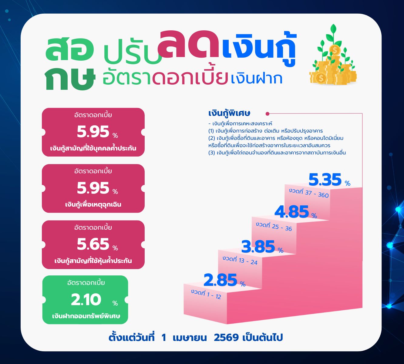 ประกาศ สอ.กษ. เรื่อง ปรับลดอัตราดอกเบี้ยเงินกู้และเงินฝาก ตั้งแต่วันที่ 1 เมษายน 2569